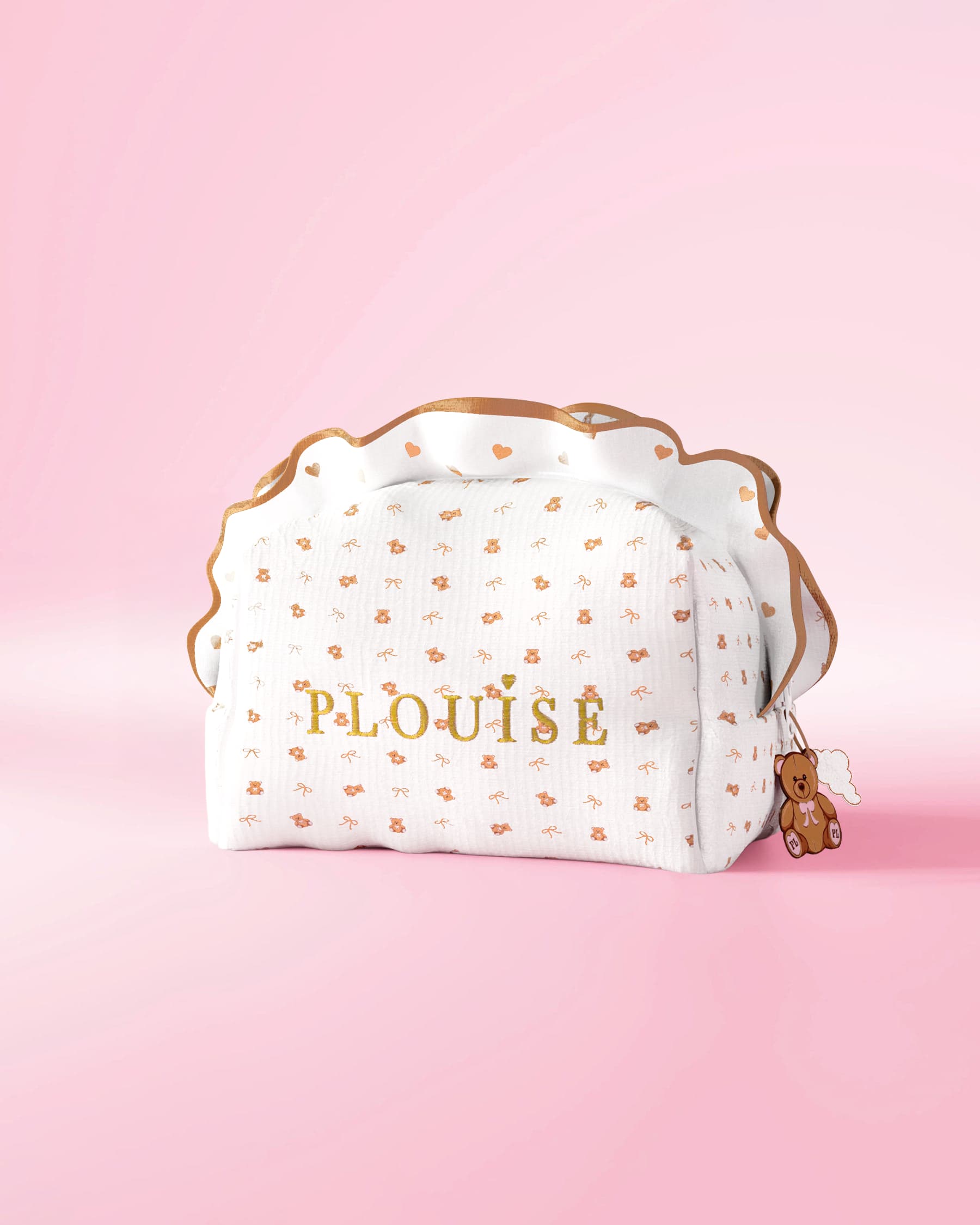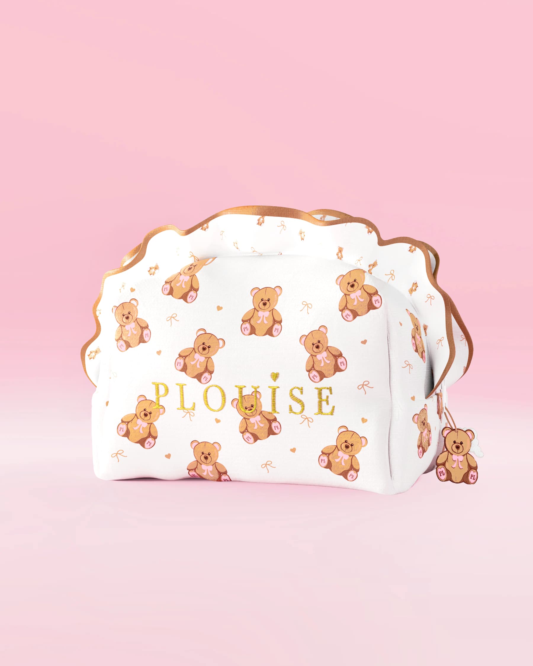 Ogni borsa è realizzata in morbido tessuto bianco, rifinita con volant e dettagli del marchio ricamati e progettata per rendere la tua routine di cura della pelle o trucco divertente, elegante e organizzata. Scegli tra Teddy a stampa grande e audace per il massimo impatto, o graziosi orsacchiotti con stampa piccola per un tocco sottile e giocoso.